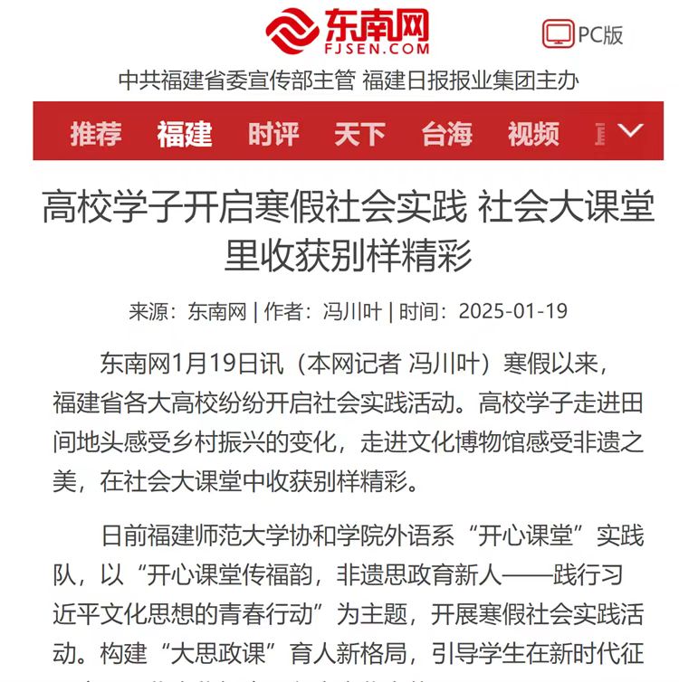 1月19日,东南网报道福建师范大学协和学院外语系“开心课堂”实践队,以“开心课堂传福韵,非遗思政育新人——践行习近平文化思想的青春行动”为主题,开展寒假社会实践活动。