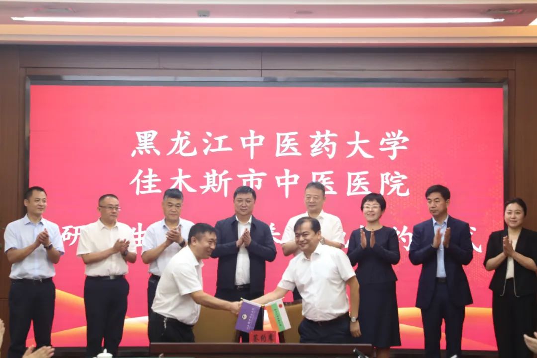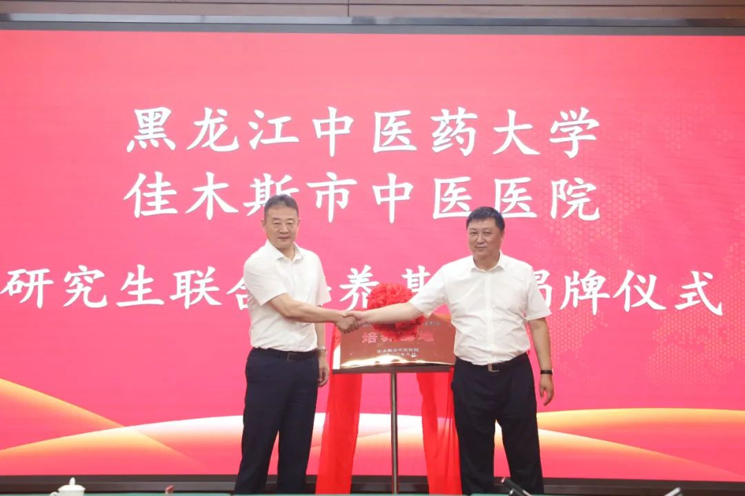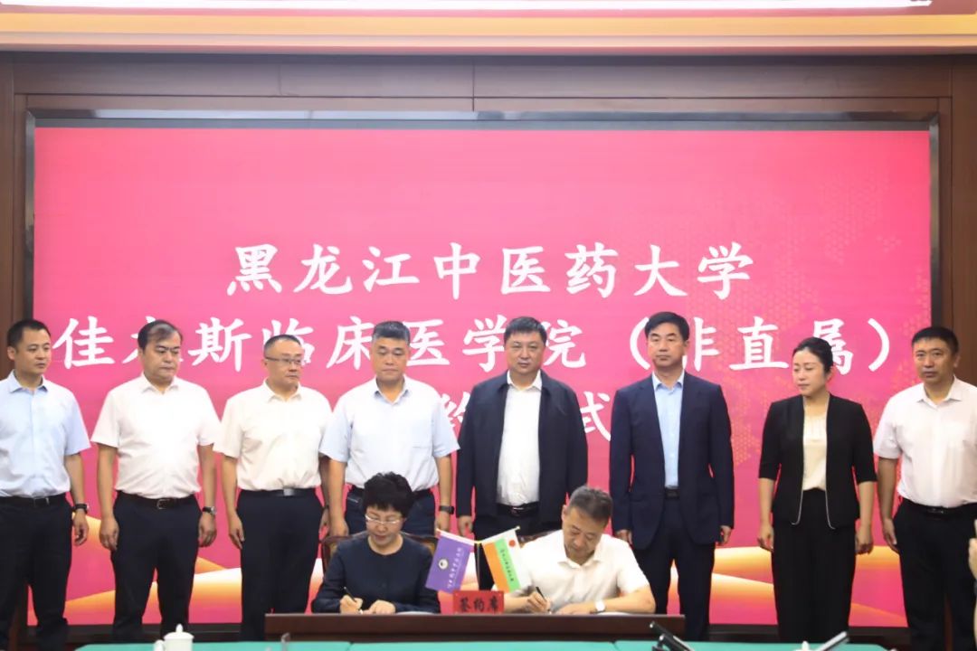 仪式上,与会人员共同观看了中医医院宣传片,郭宏伟与佳木斯市副市长聂影代表校政双方签订黑龙江中医药大学与佳木斯市人民政府共建黑龙江中医药大学佳木斯临床医学院(非直属)协议书,学校研究生院院长张洋与佳木斯市中医医院党委书记于俊洲签订黑龙江中医药大学中医专业硕士学位研究生联合培养基地协议书。(李和伟、裴振萍 黑龙江中医药大学)