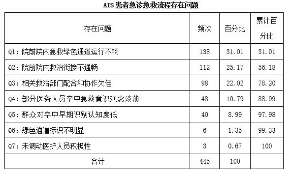 急诊科脑卒中质量控制小组收集AIS患者急诊急救流程存在问题,统计数据,并进行柏拉图分析。