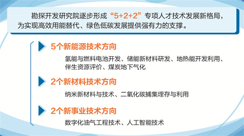 勘探开发研究院按照集团公司“清洁替代、战略接替、绿色转型”三步走总体部署,大力实施绿色低碳发展战略,把握“三新”领域基础研究前沿动态及产业发展方向,瞄准公司油气工业产业升级、产业发展和公司转型的重大需求,持续培养行业领军人才,通过机制创新,逐步探索出一条独具特色的高水平人才成长之路,强化“学科互联”创新管理。目前,勘探开发研究院确定了“氢能与燃料电池开发、储能新材料研发、地热能开发利用、伴生资源评价、煤炭地下气化”5个新能源技术方向;“纳米新材料与技术、二氧化碳捕集埋存与利用”2个新材料技术方向和“数字化油气工程技术、人工智能技术”2个新事业技术方向,逐步形成“5+2+2”专项人才技术发展新格局,为实现高效用能替代、绿色低碳发展提供强有力的技术支撑。
