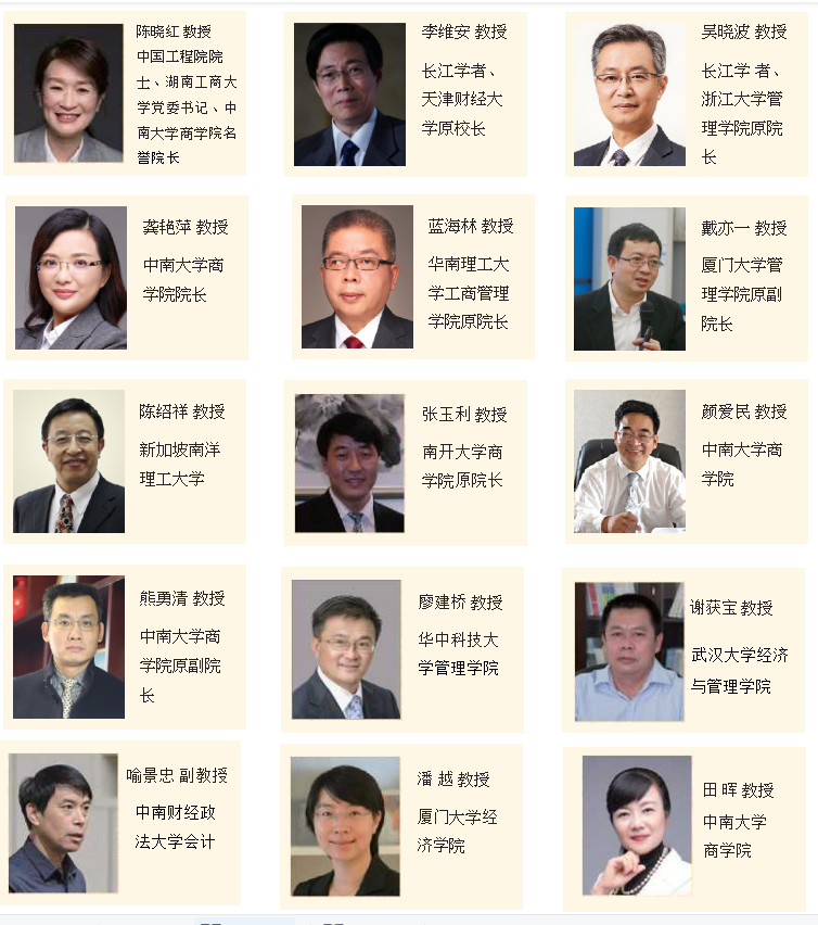 中南大学商学院立足于“融理工精髓,创商学新知,培养厚德守信、敢为人先的商界精英”的使命,秉承“天道酬勤”的院训,致力于“打造新时代具有国际影响力的卓越商学院” 。中南大学商学院始终保持创新开放的态势,与国际办学水平接轨,拥有一支层次较高、梯次有序、结构合理、充满活力的高水平师资队伍。在湖南顶级精英师资基础上,汇集了国内商学名师,聘请了国内外知名商学院及机构的杰出学者,不断地开展创新性的合作项目与课程。深谙中西前沿管理理念和国际现代管理实践的杰出师资团队,以精准的商业视角和丰富的教学经验,助力企业管理者领导力和竞争力的提升,为中南大学EMBA教育项目奠定了坚实的基础。部分拟请师资如下:
