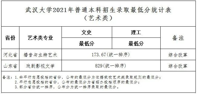 武汉大学2021年普通本科招生录取最低分统计表(艺术类)