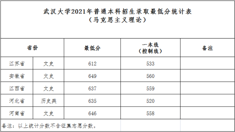 武汉大学2021年普通本科招生录取最低分统计表(马克思主义理论)