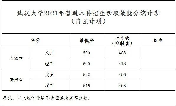 武汉大学2021年普通本科招生录取最低分统计表(自强计划)