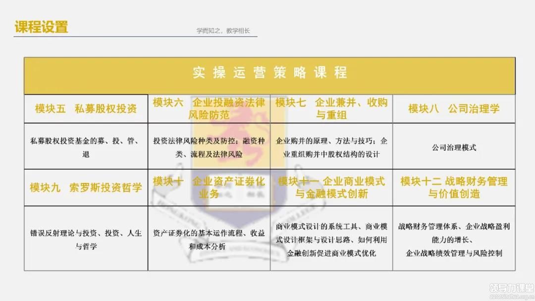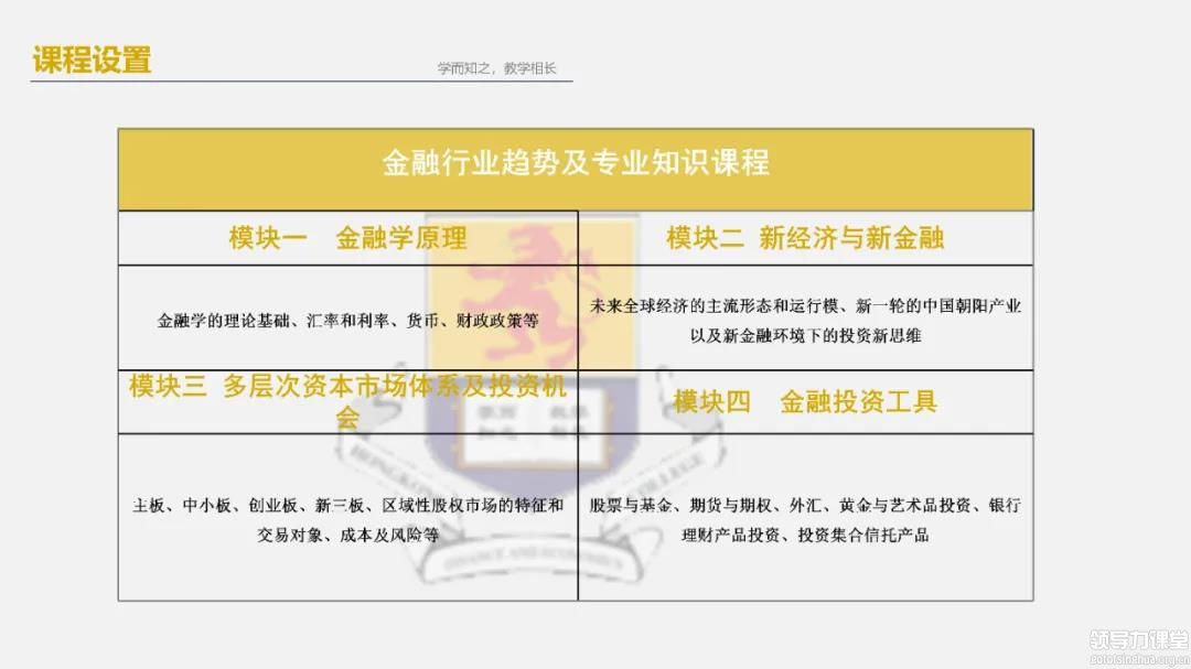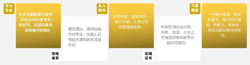 教学特色随着全球经济一体化的快速发展,资本与产业相结合成为必然趋势,从产到融是新生代企业的自我进化。国际金 融动荡不断加剧,汇市、股市持续剧烈震荡,金融风险的爆发频率显著增高,企业经营者欠缺金融理论与方法, 对宏观经济与资本市场判断力不足,实体与资本结合的竞争力急需打造。