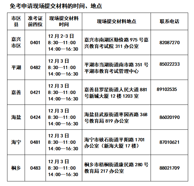 一、课程免考申请登记的时间为11月23日00:00-12月2日24:00,现场提交材料的时间及地址见公告底部表格。