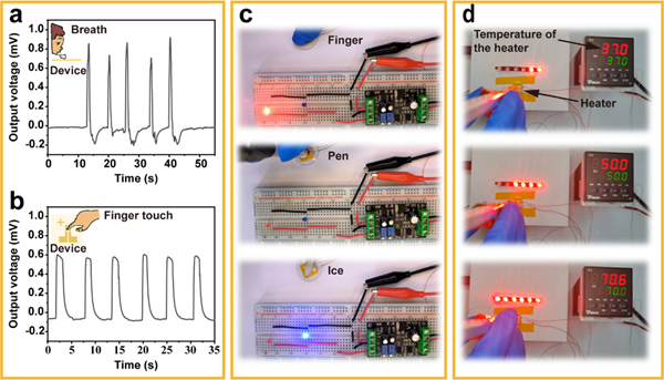 柔性温度-压力双参数传感器广泛应用于人体健康监测和智能机器人传感等领域,因而受到了广泛关注。然而,目前柔性温度-压力传感器基本都采用两种独立的传感材料实现双参数传感功能,这不仅提高了传感器的设计-集成难度,也增加了制造成本。因此,研发具有多功能一体化的先进传感材料成为本领域的研究重点和难点问题。碲化铋是一种能将热能直接转换为电能的半导体材料,其产生的电压与施加在材料两端的温差成正比关系,可用于温度传感;同时,该类材料在受到应力作用时,带隙会发生明显改变,表现出压阻效应,从而还可以实现压力传感。但碲化铋半导体具有本征的刚性和脆性,力学和加工性能较差,难以弯曲变形、精密加工和高密度集成器件。