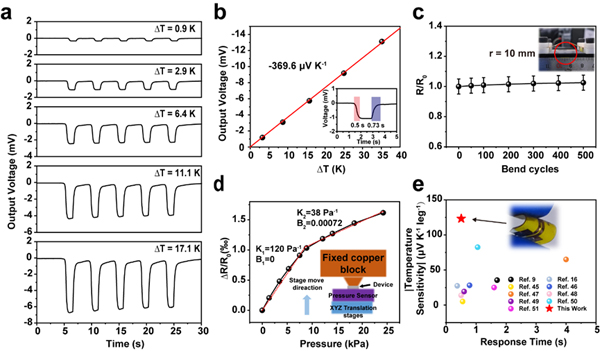 图3. 传感器温度-压力传感性能及柔性性能测试