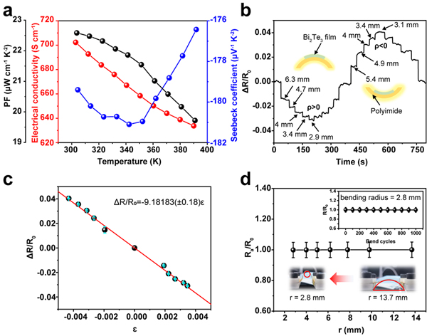 图1. 设计制备的Bi2Te3/PI薄膜热电、压阻及柔性性能测试结果