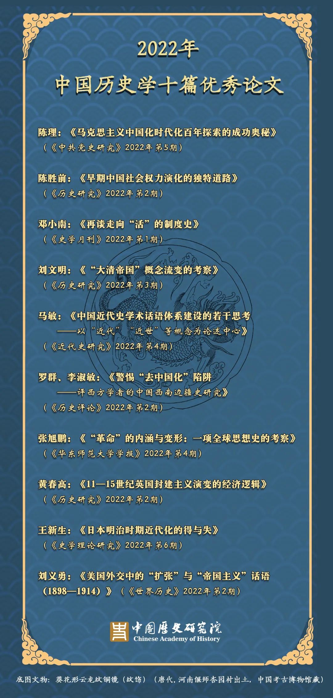 为反映中国历史学研究前沿,构建权威、科学、公正的历史学评价体系,引领新时代中国史学繁荣发展,中国历史研究院历史研究杂志社自2020年开始推出年度报告《中国历史学前沿报告》,旨在梳理研究进展、盘点研究热点、评选优秀论著。通过专家推荐、大数据采集、课题组筛选、问卷调查、专家审定等程序,我们评选出2022年度中国历史学十大研究热点、五部优秀著作和十篇优秀论文。优秀论文排名不分先后。