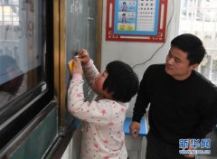 陈伟(后排左)和黄晓青(后排右)在学校与学生们合影(3月15日摄)。在安徽省岳西县青天乡老鸭村上海气象希望...