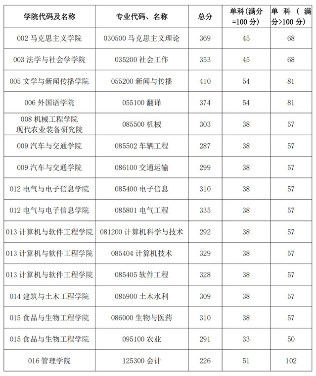 同一二级招生单位同一专业全日制、非全日制进入复试的初试成绩基本要求相同。“退役大学生士兵”专项计划的考生,初试成绩总分为500分的复试分数线总分不低于250分,单科不限;初试成绩总分为300分的复试分数线总分不低于160分,单科不限。以上二级招生单位的其余专业和其它二级招生单位的所有专业均执行2023年国家A类考生分数线。