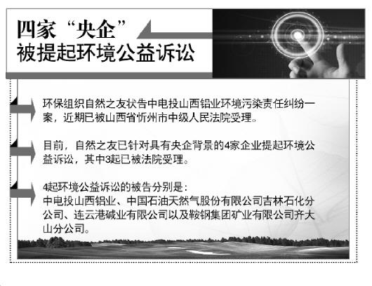 據了解,近期,自然之友已連續提起4起環境公益訴訟,這4起環境公益訴訟的被告分別是:中電投山西鋁業、中國石油天然氣股份有限公司吉林石化分公司、連雲港鹼業有限公司以及鞍鋼集團礦業有限公司齊大山分公司。公開資料顯示,這4家企業均是具有央企背景的大企業。