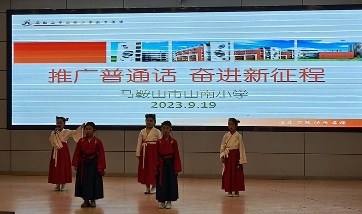 横平竖直皆风骨,撇捺飞扬是血脉。汉字是中华传统文化的重要载体,在文化传承中发挥着不可替代的作用。说普通话,写规范字,学习和传承中华优秀传统文化,是我们每个人的职责。当天上午,在山南小学阶梯教室里,正在开展一场以“推广普通话、奋进新征程”为主题的活动。同学们身着汉服,通过一个个精彩的节目演绎着“说普通话、写规范字”的重要性。大家将经典诗词朗诵与普通话推广相结合,展示中华传统文化之美,号召同学们使用文明、规范的文字交流,营造“说普通话、写规范汉字、做文明人”的良好氛围。