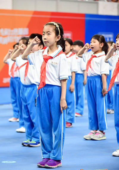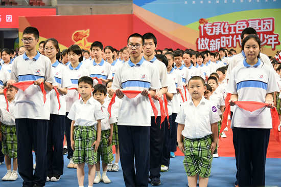 5月31日,北京市“东城区北东学区‘传承红色基因 做新时代好少年’团、队衔接主题活动”在国家网球中心钻石球场举行。现场举行庄严的初中少先队离队和小学的入队仪式,离队的初中生将手中的红领巾戴在入队的小学生胸前。席茜/摄