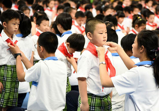 离队的初中生将手中的红领巾戴在入队的小学生胸前。席茜/摄