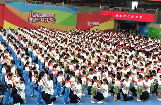 震撼的万人球场,增强小学生的庄严入队仪式感,为孩子们留下终生难忘的神圣记忆。在充满青春活力的啦啦舞和熟悉的歌曲《让我们荡起双桨》之后,现场举行庄严的少先队离队和入队仪式。学区所属的831名初中生进行离队仪式,初中生从胸前摘下鲜艳的红领巾捧在手中;随后,学区所属685名小学生一对一站在初中生面前进行入队仪式,离队的初中生将手中的红领巾戴在入队的小学生胸前。红色象征光明,凝聚力量,引领未来。传承红领巾,传承的是革命红色基因,传承的是一份少先队员的责任。