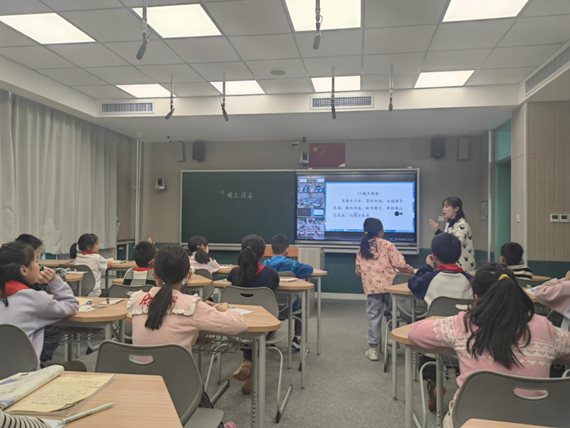 教室前方的黑板前,一块大大的显示屏被分为好几个场景:教学板书、北京史家胡同小学的师生以及雄安史家胡同小学的师生。细心观察你会发现,两地的学生课桌都是一模一样。