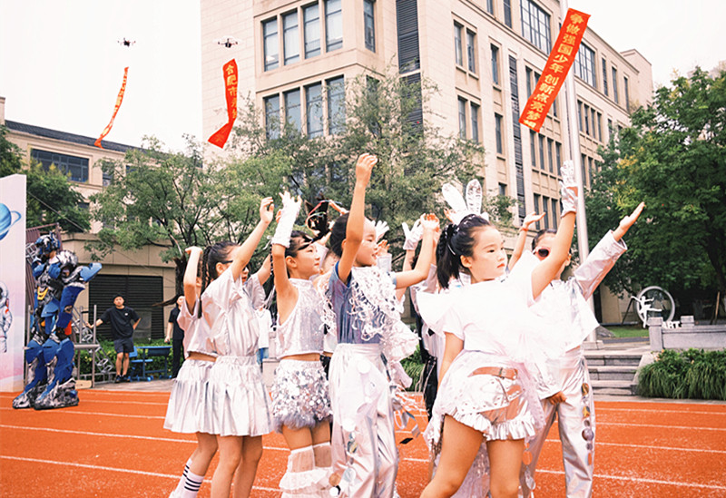空天地协同展演——校无人机社团操控无人机凌空起舞,在操场上方变换出“火箭穿云”“星辰漩涡”等动态阵列;与此同时,二(1)班学生身着发光机甲套装,在地面同步演绎原创科技舞台秀。当无人机群化作“太空补给站”低空悬停时,小演员们通过编程指令触发机甲灯光响应,天地光影实时交互,将硬核科技与艺术创想深度融合,为师生呈现了一场震撼的视听盛宴。