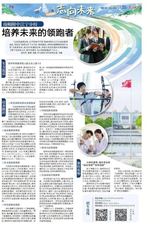 “让优秀者更优秀,让平常者不平常”是南师附中江宁分校的教育追求,学校以“培养以天下为己任、具有健全人格和创新精神的现代公民”为培养目标,自2003年建校以来,学校已先后向国内外高校输送了数千名优秀人才,其中仅清华、北大两校就输送了24人。