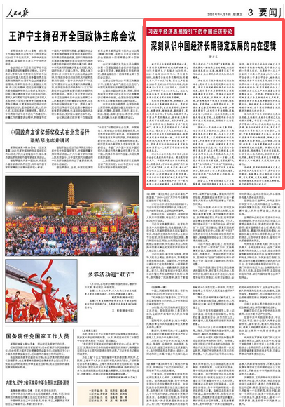 新中国成立特别是改革开放以来,中国经济发展取得的成就举世瞩目。1978年国内生产总值为3679亿元,2024年达到134.9万亿元,年均增长8.8%,远高于全球经济同期约3%的增速水平。“十四五”时期,国内生产总值在2020年突破100万亿元大关后,先后跨越110万亿元、120万亿元、130万亿元,今年预计可达140万亿元。这么大的经济体量,能够保持长期稳定发展,其背后蕴藏着深刻的内在逻辑。【全文】