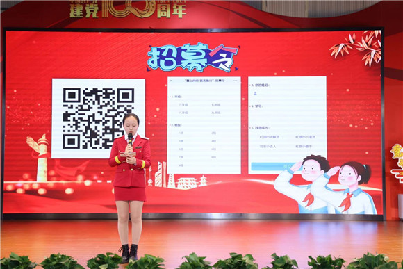 党课结束以后,上海青云中学“红色宣讲团”成员李涵语,郑重发布“童心向党、砺志前行”青云学子百日行动招募令。引导少先队员们从“学,行,秀”三个方面出发,用心悟,用耳听,用口说的方式学习党史,寻访红色基地,表达对党的热爱以及对祖国母亲深深的祝福。
