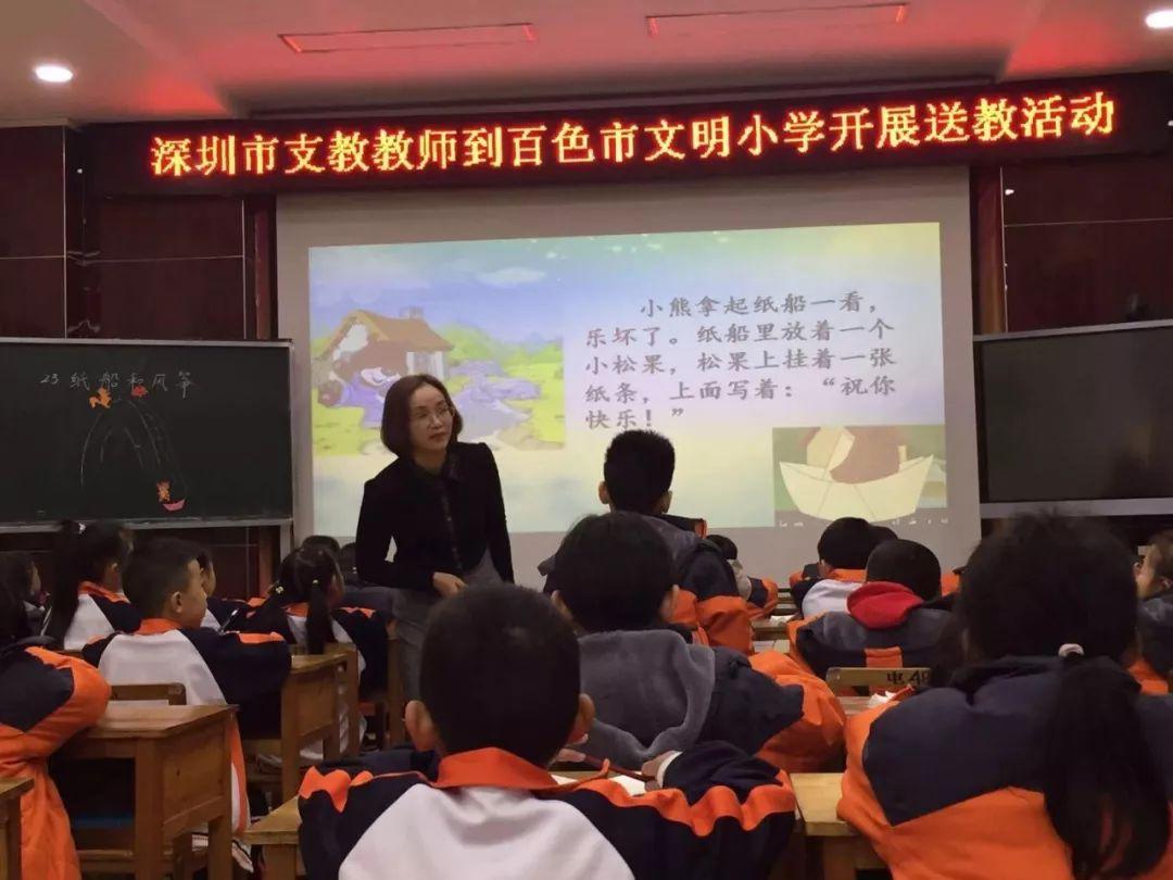 那坡县城厢镇深龙小学是龙岗在那坡援建的一所小学,张弋燕老师依托龙岗花城小学的各项教育资源,资源共享,结合学校实际情况,积极配合学校领导完善学校各项教学管理制度。在教学工作中,用深圳的务实精神和前沿的教育理念影响着这里的老师和孩子;平时深入课堂听课,课后和老师们积极评课,相互探讨,帮助青年教师尽快成长;在她与团队的精心打造和帮助下,学校老师取得了百色市数学教学技能大赛一等奖的好成绩;作为学校的教学教研负责人,她积极开展教研活动,指导各学科教学工作;平时注重研究课程的教学方法,特别注重教学设计,并主动上公开课,给全校老师起示范引领作用。