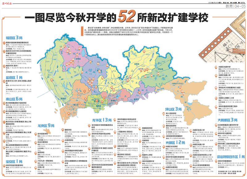 深圳新闻网2023年9月4日讯(深圳晚报记者 王宇 刘夏蓝 陈仪衡 实习生 张唯一 瞿文君 整理)要实现“幼有善育、学有幼教”,学位保障是关键。近年来,深圳在打造“民生幸福标杆”的道路上,不断推进学位建设。加快基础教育增量提质是深圳2023年10项年度民生实事之一,上半年,深圳校园建设速度不断加速。今秋9月,大批新改扩建学校将一一亮相。深晚记者整理了深圳52所2023年秋季开学的新改扩建学校分布图。市民将在一个个具体的坐标上,更加直观地感受到深圳加快基础教育提量增质的决心。