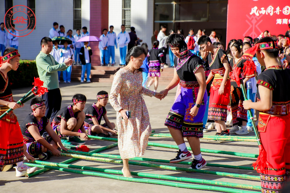 参加校庆的人们在校园内体验竹竿舞。海南省国兴中学供图