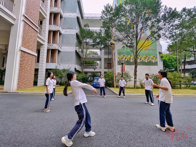 课间,侨中学生结伴玩起排球接力。记者 易承乐 摄
