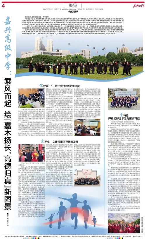 在嘉兴高级中学党总支书记、校长张照荣的毕业致辞中,有感怀、有期望,更有诸多热切的祝福:“走向外面的世界,需要热忱与勇敢,需要简单与快乐,需要蓄能和计划,需要突破和创造……孩子们,嘉高是你们中学阶段的终点,更是你们迈向新生活的起点。嘉高最年轻的校友们,在你们意气风发踏上前途时,请你们牢记自己嘉高人的身份,‘嘉木扬长,高德归真’,嘉匠心以成才识,高德心以归本真。”