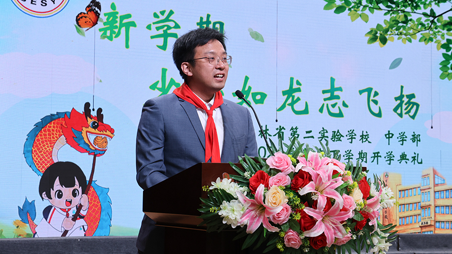 甲辰龙年,万象更新,吉林省第二实验学校师生一起走进了充满希望的新学期。2024年3月5日,吉林省第二实验学校中学部召开了以“新学期,少年如龙志飞扬”为主题的开学典礼。出席开学典礼的领导有陈杰校长、孙成群副校长、石馨副校长、孙爱华副校长。同时陪伴同学们共同开启新学期的还有南湖中学的全体教师、心理健康中心和南湖小学的老师们。各年级、班级的优秀担当及家长代表在主会场就座,各班级的分会场同步直播典礼,全体师生以振奋昂扬之姿开启新学期。团委书记兼大队辅导员丁旭老师主持开学典礼。