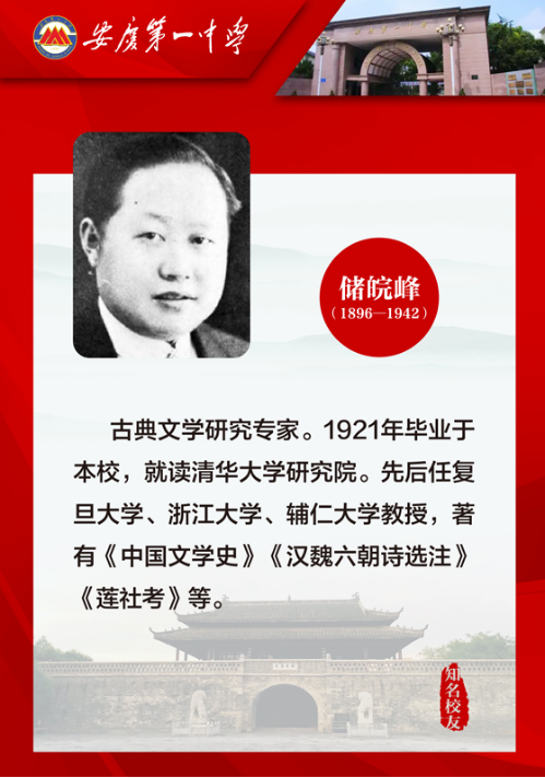 储皖峰先生系我校在安徽省立第一师范学校时期培养的优秀学子,后在南方大学、北京大学求学,1927年于清华大学研究院专攻文史, 1929年起先后任教于上海中国公学、复旦大学、浙江大学等高校, 1933年受聘北平大学、辅仁大学。抗战期间坚持执教辅仁大学,编写《中国文学史》教材,因战乱与家人分居,健康恶化,1942年病逝。