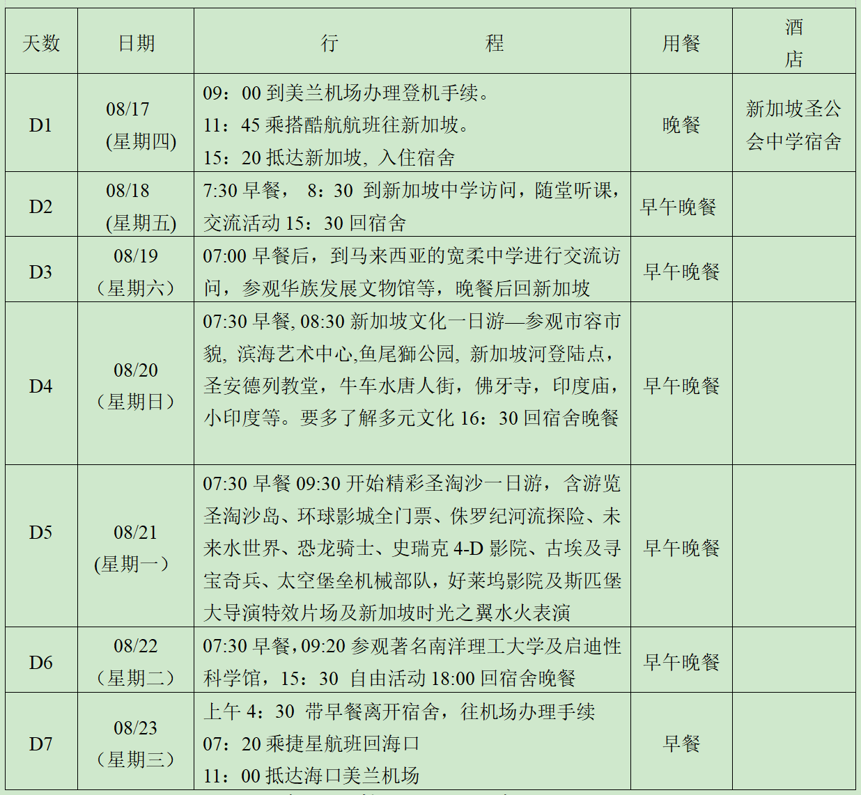(一)新加坡/马来西亚游学交流团行程表(传统项目)
