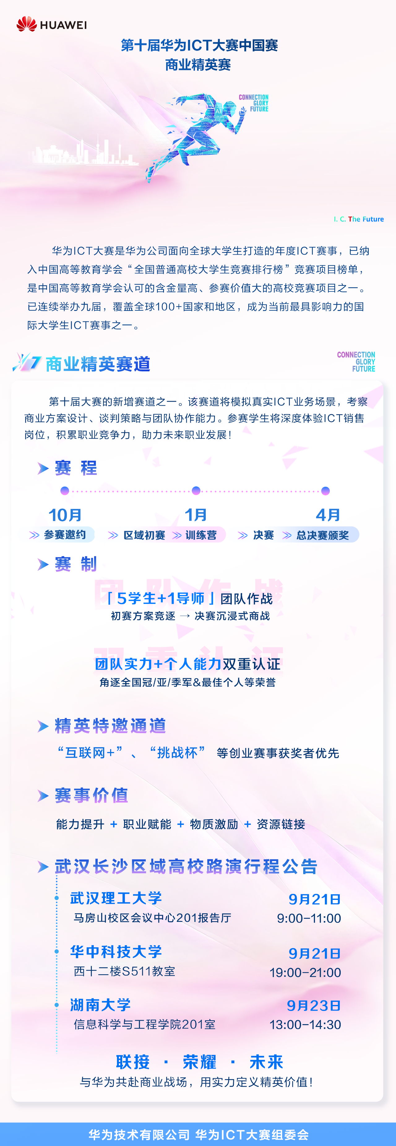 华为ICT大赛是华为打造的面向全球高校的年度ICT赛事。大赛以“联接、荣耀、未来”为主题,以“I.C.TheFuture”为口号,自2015年举办以来,影响力日益增强:在中国被纳入全国普通高校大学生竞赛项目榜单;在海外被纳入UNESCO全球技能学院的关键伙伴旗舰项目。前九届大赛累计吸引全球100多个国家和地区、2000多所院校96万余名师生报名参赛。