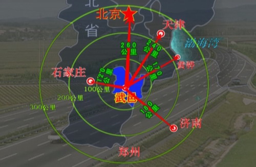 武邑县地处东经115°45′--116°08′,北纬37°37′--38°00′之间,东西最宽27公里,南北最长42.5公里,总面积830.1平方公里。位于河北省东南部,衡水市东北部,东邻阜城县、景县、西接桃城区、深州市,南与枣强县接壤,北与武强县毗连,东北与泊头市为邻。 地处京津都市经济圈和临港经济半径辐射范围之内,北距北京260公里、天津240公里,西距石家庄120公里,东距黄骅港170公里,南距郑州460公里,西上大广高速10分钟车程。境内公路纵横交织,1条国道(106)、5条省道(衡德路、宁武路、武千路、040、衡井路)穿越全境,正在建设的邯黄铁路在境内设衡水东站,与石德铁路在清凉店镇形成黄金十字交叉,连通东西,通衢南北,历来是商贾创业寻梦、人才聚集逐鹿的理想之地。