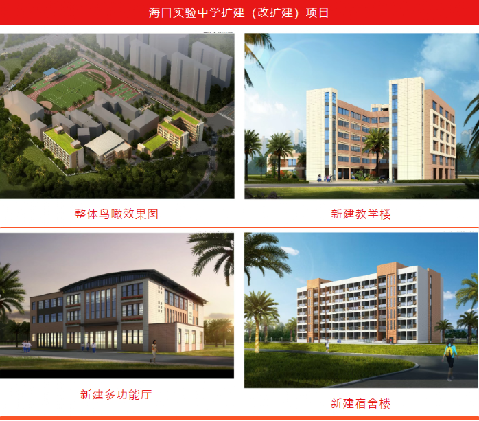 海口实验中学启动扩建(改扩建)项目,计划于2025年9月份投入使用,新建1栋6层教学楼、1栋3层多功能厅与1栋6层男生宿舍楼,总建筑面积达22822平方米。其中,教学楼面积11284.04平方米,含25间教室;多功能厅2243.04平方米,可容纳约1000人;男生宿舍9211.57平方米,设 1328个床位。配合海南省2025年高中阶段教育招生计划,我校高中部招生总数扩至1000名,新增4个班级、200名学生,新建设施将为扩招提供有力保障。